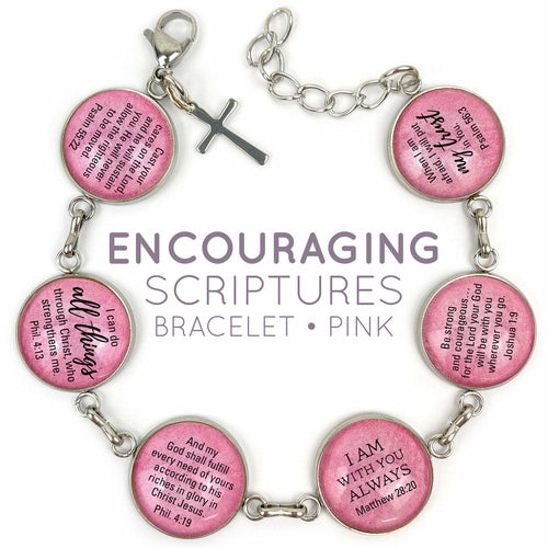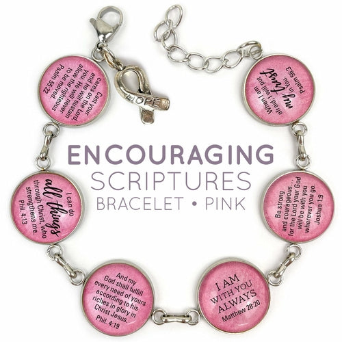 This beautiful charm bracelet features six encouraging Bible verses magnified under six glass charms on your choice of a pink or a neutral-colored background, and a dangling "Hope" ribbon charm, a cross charm, or a heart charm.